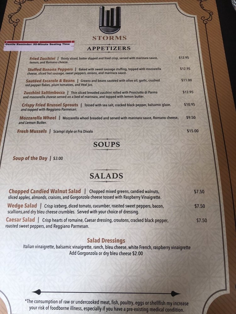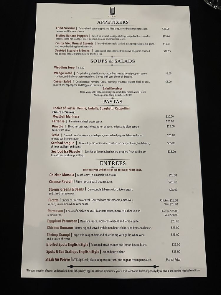 Storms Restaurant & Byob in Pittsburgh, PA offers a delightful Italian dining experience with a range of options. The menu features appetizers such as Fried Zucchini and Stuffed Banana Peppers, soups like Soup of the Day, and salads like the Storms Summer Salad and Chicken Caesar Salad. Customers rave about the diverse flavors and generous portions, with dishes like the Seafood Trio and Chicken Parmesan standing out. The cozy ambiance and attentive service add to the overall dining experience. As a BYOB establishment with prices under $30, Storms Restaurant & Byob is a favorite among locals for its delectable cuisine and inviting atmosphere.